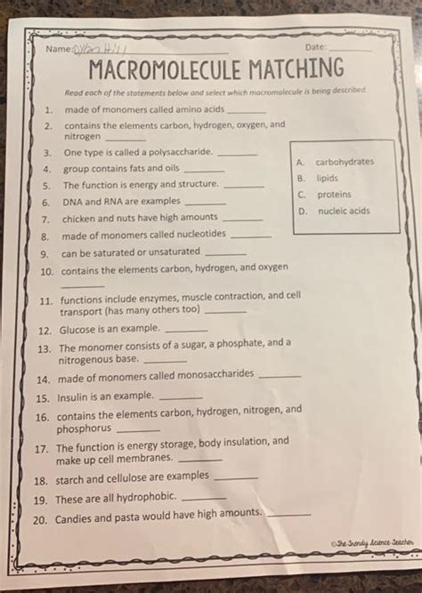 Macromolecule Matching Worksheet Answers Master of Documents from tutore.org